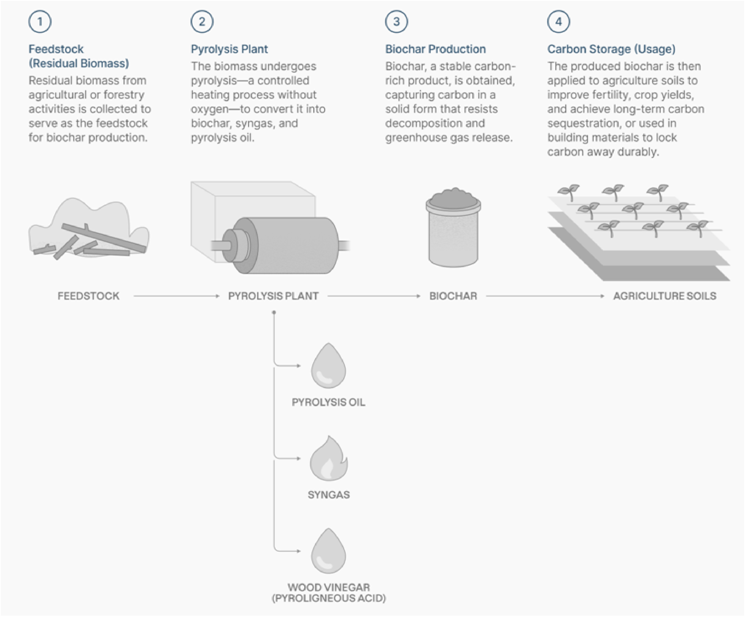 Involves thermochemically converting biomass or organic waste, such as agricultural residues, into a stable, carbon-rich material known as biochar through pyrolysis. Biochar is highly resistant to decomposition, effectively storing carbon for centuries or millennia while simultaneously enhancing soil health, fertility, and productivity. It supports nutrient retention, water conservation, microbial activity, and overall resilience of degraded soils, making it a valuable tool for sustainable agriculture.